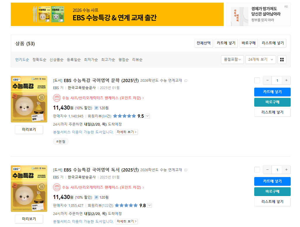 이 온라인 서점에서 ‘2026 수능특강’ 검색 후 ‘교재 상세 정보’로 들어가시면, 책 미리보기와 구매처 리스트를 확인하실 수 있답니다.