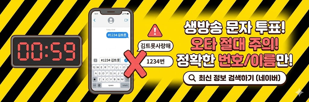 실시간 문자 투표는 방송 화면에 안내되는 '#문자번호'(예: #4560 등 방송 당일 공개)로 참가자의 기호 번호나 이름을 적어 보내는 방식입니다. 여기서 가장 중요한 주의사항은 '오타'와 '중복 투표'입니다. 참가자의 이름을 적을 때는 띄어쓰기 없이 정확한 이름을 적어야 하며, 별명이나 애칭을 적으면 무효표가 됩니다. 예를 들어 참가자 이름이 '김사랑'이라면 '김사랑'이라고 정확히 적어야지, '사랑이', '사랑짱' 등으로 보내면 인정되지 않습니다. 또한, 번호로 투표할 때도 해당 참가자의 고유 번호만 딱 적어서 보내는 것이 가장 안전합니다. 긴 응원 문구를 함께 적어 보내면 시스템이 인식하지 못할 수도 있으므로, 투표 문자에는 오직 '번호' 또는 '이름'만 적는 것을 강력히 추천합니다.